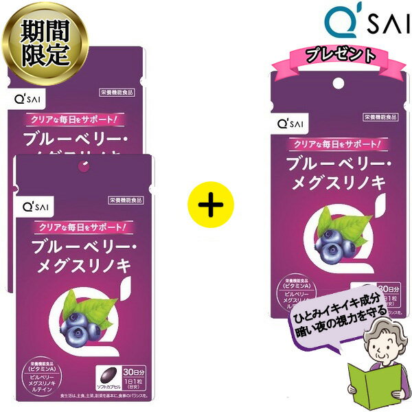 | 商品情報 キューサイのブルーベリー・メグ【期間限定販売】 キューサイ ブルーベリスリノキは、【栄養機能食品】<ビタミンAー メグスリノキ 30粒2袋購入で1袋増による個別審査を受けたものではありません。 ※パッケージは予告なく変更になる場合がございます。 食生活は、主食、主菜、副菜を基本に、食事のバランスを。 |