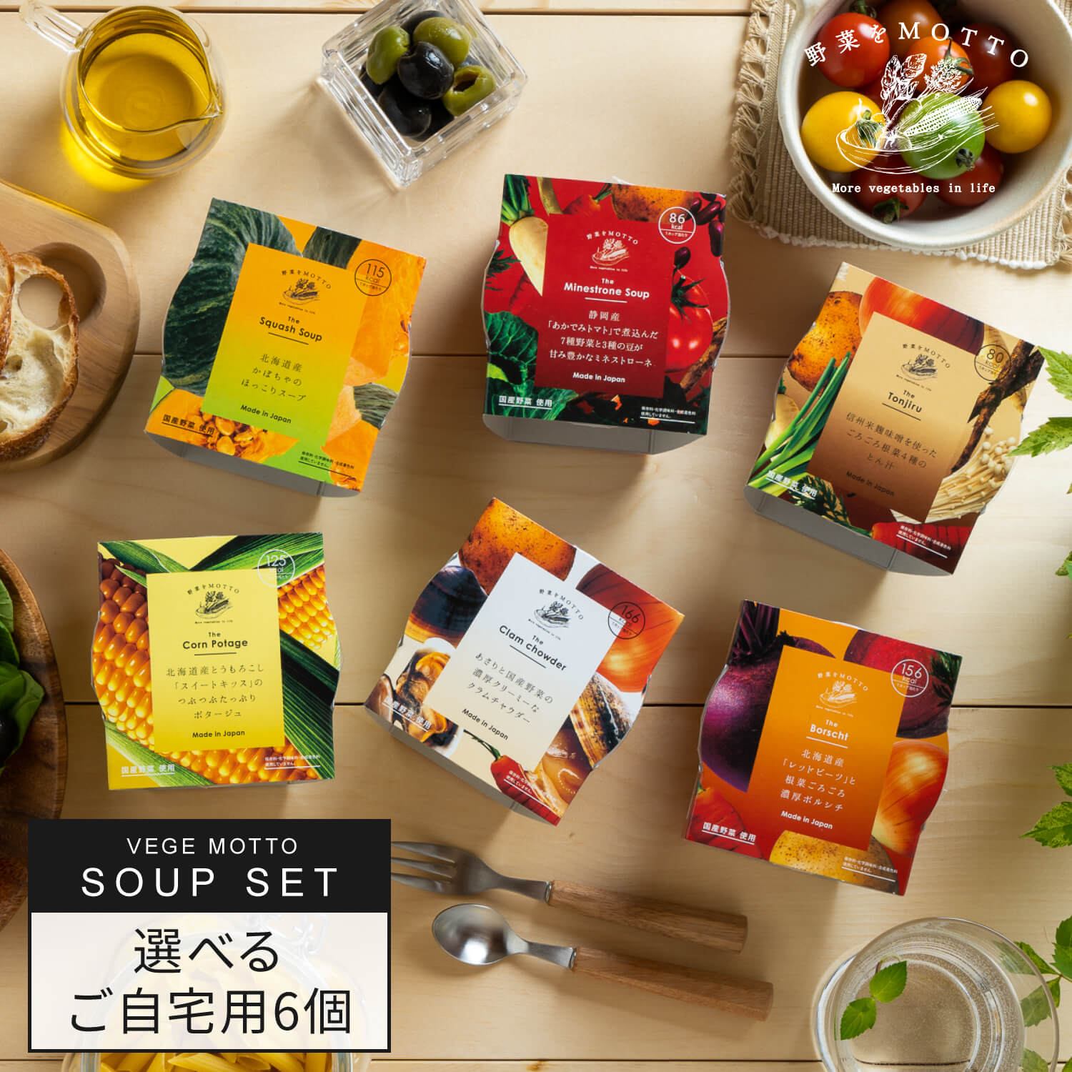 | ※保存料を使用していない為、賞味期限は製野菜をMOTTO スープ 6個 セット 造日から9ヶ月となります。 お届けは賞味種類 選べる | レンジ 1分 野菜スー上の商品を配送します。フレーバーが選べるレンジカップスープ6個セット 4,880円(税込)送料込み 購入はこちら > 詳しくはこちら |