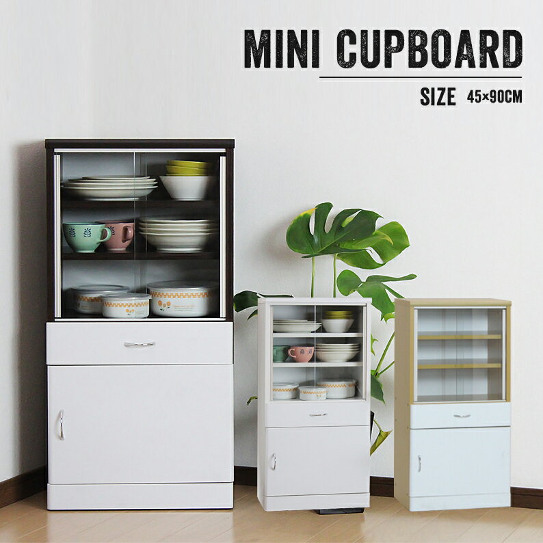【幅45cm 高さ90cmのコンパクトなミニ食器棚】引き戸 スリム 食器棚 オフィス 事務所 給湯室 カップボード 木製 引き出し 引出し 扉 ガラス 1人暮らし